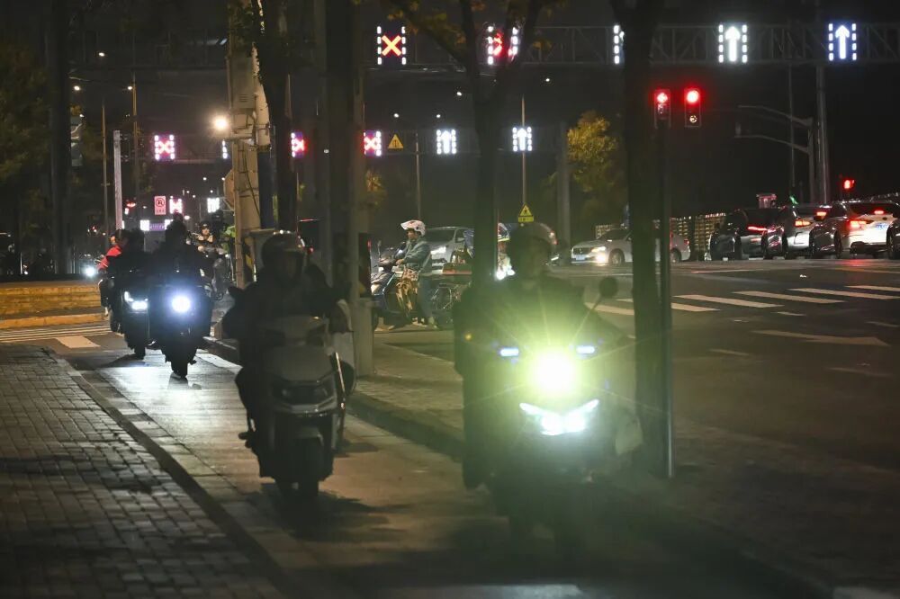 11月14日,在上海市郊一处路口,部分电动自行车的车灯令人眩目。
