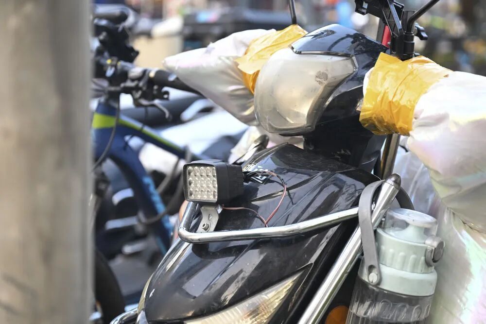 11月14日在上海市中心街头拍摄的一辆加装灯具的电动自行车。